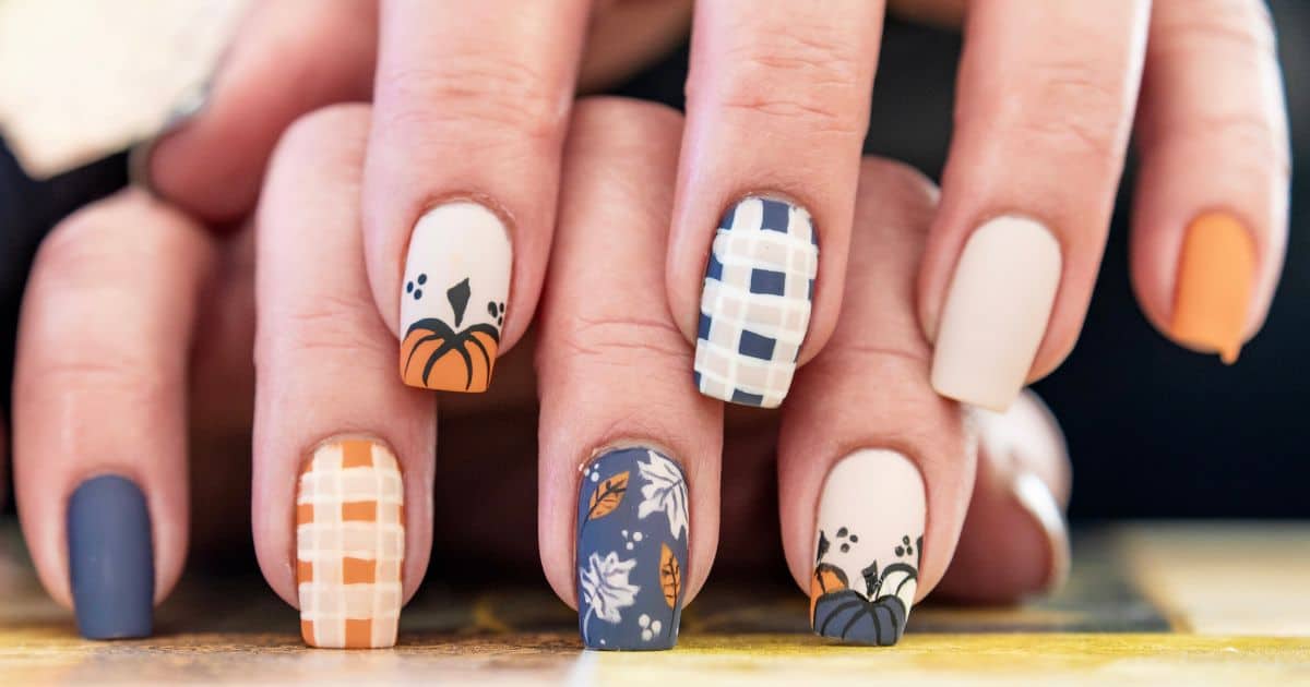 close up image of white, grey, and orange fall themed nails.